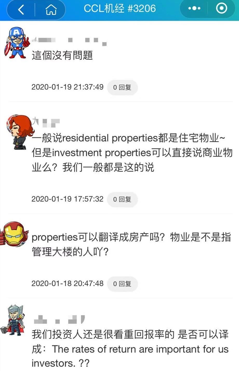 专门的讨论区里方便了同学对各种题型的提问,甚至生活中的问题也可以在这里讨论,用他们的话说,用了达澳CCL 小程序的大家就是自己人,任何问题大家有知道的一定会互相帮助。